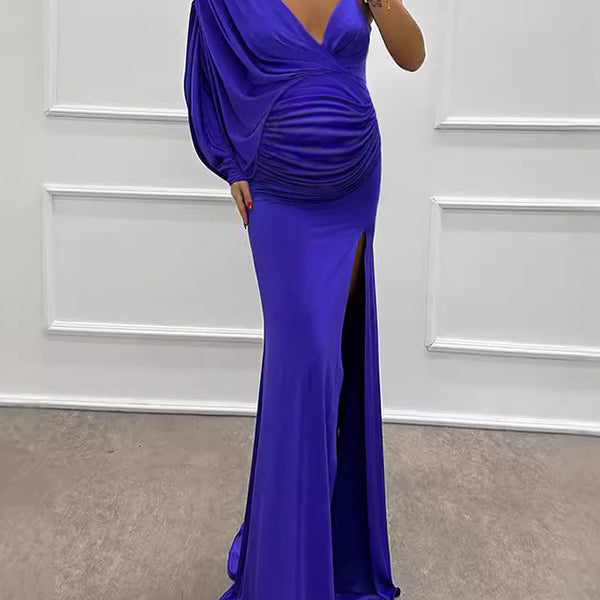 Chicnmom Vestido Largo de Premama Ajustado Fiesta para Invitadas Con Pliegues y Escote Pico para Embarazadas Noche