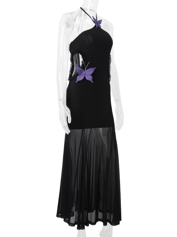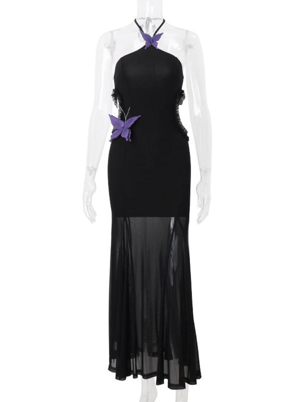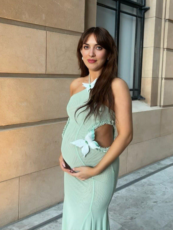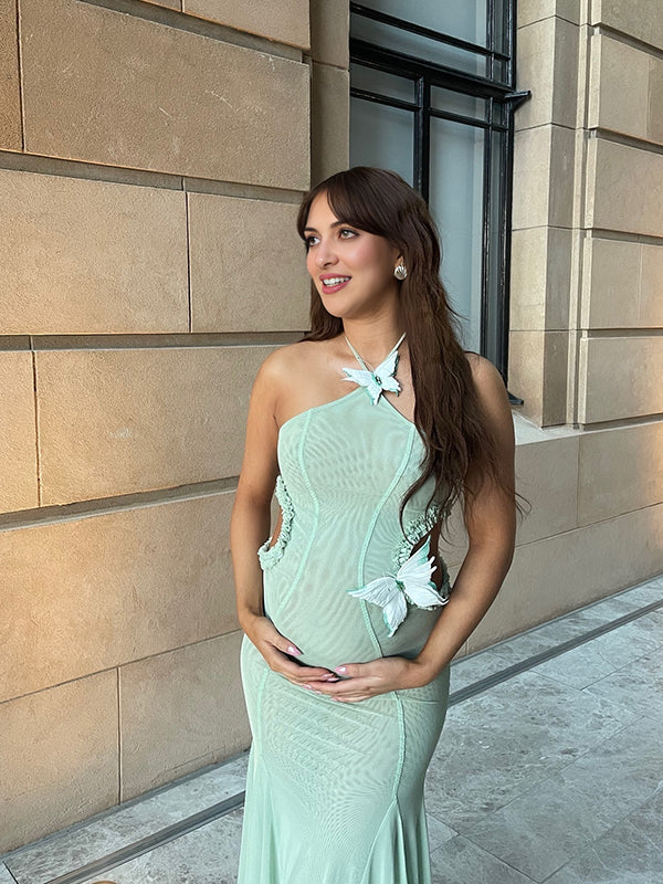 Chicnmom Mama Vestido largo con corte de malla de mariposa en 3D, camisola sin espalda, cóctel de sirena, sesión de fotos de maternidad